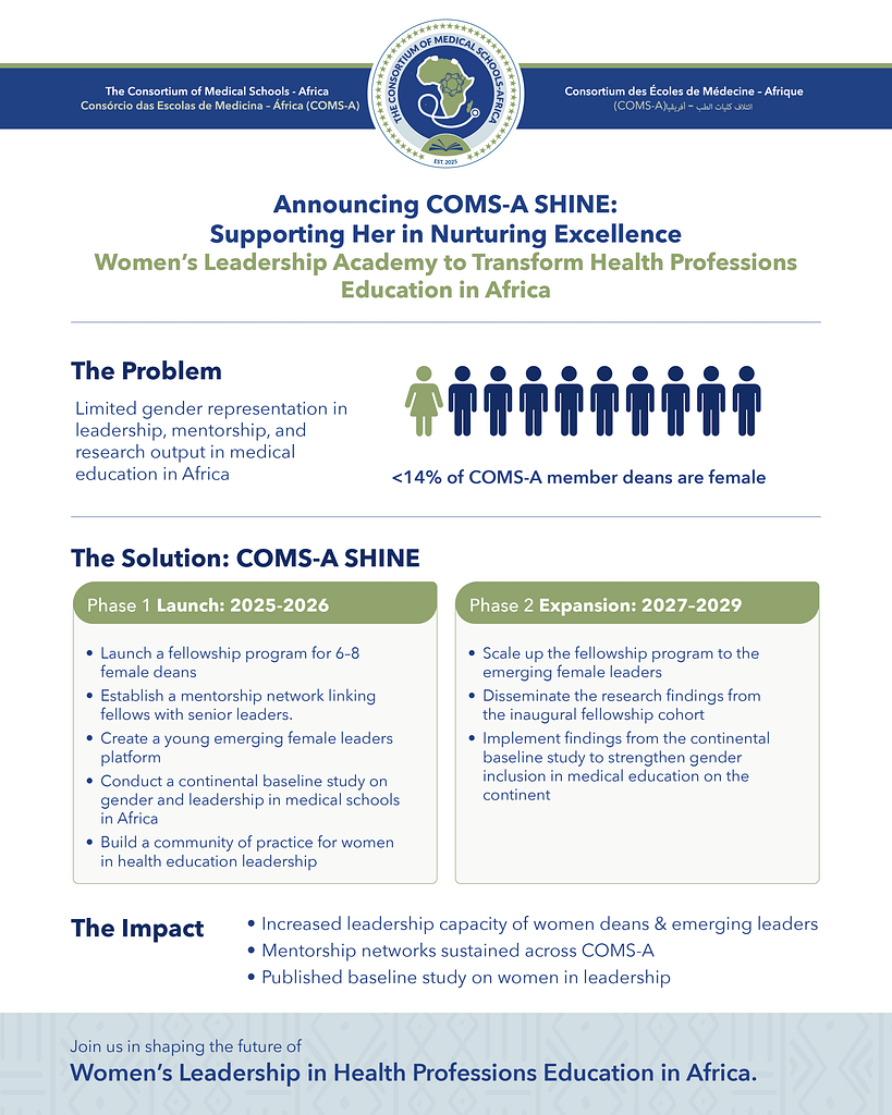 The Consortium of Medical Schools–Africa (COMS-A) was launched on March 25, 2025, during the Advancing Medical Education in Africa Conference in Kigali, Rwanda. It is a unified, African-led initiative formed by medical education leaders to address the continent’s healthcare and education challenges. COMS-A fosters collaboration, resource-sharing, and best practice exchange in medical education, research, and healthcare delivery. Its mission is to develop a socially accountable medical workforce to meet Africa’s unique health needs. The University of Global Health Equity in Rwanda serves as its secretariat.