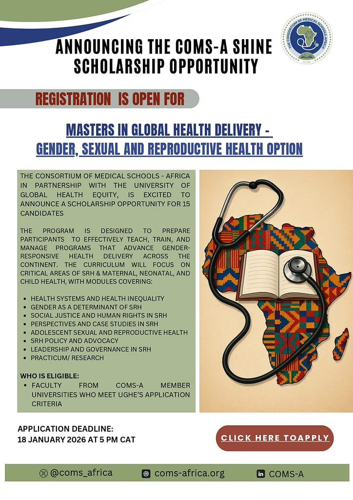 The Consortium of Medical Schools–Africa (COMS-A) was launched on March 25, 2025, during the Advancing Medical Education in Africa Conference in Kigali, Rwanda. It is a unified, African-led initiative formed by medical education leaders to address the continent’s healthcare and education challenges. COMS-A fosters collaboration, resource-sharing, and best practice exchange in medical education, research, and healthcare delivery. Its mission is to develop a socially accountable medical workforce to meet Africa’s unique health needs. The University of Global Health Equity in Rwanda serves as its secretariat.